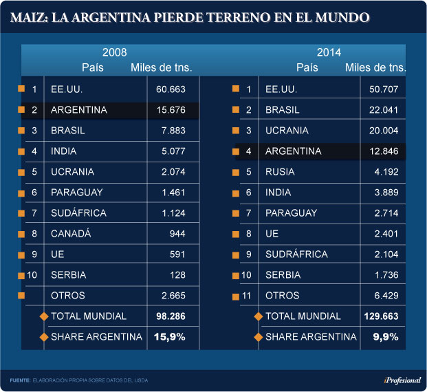 En el caso del maíz, la pérdida de protagonismo de la Argentina como proveedora también se hizo evidente: en 2008, el país ocupaba el segundo lugar, siendo sólo superado por los EE.UU.