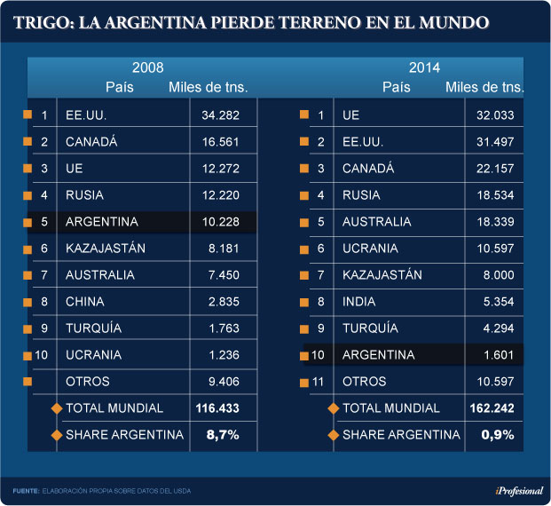 En la actualidad, en cambio, el país retrocedió hasta el décimo lugar, con un volumen de trigo que ni siquiera representa el 1% de las exportaciones mundiales (ver cuadro).
