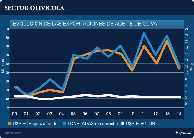 Según el relevamiento de la COPAL, en el último año la producción de aceite de oliva alcanzó las 19.000 toneladas, lo que implicó un desplome de casi 35% frente a los niveles de 2013.