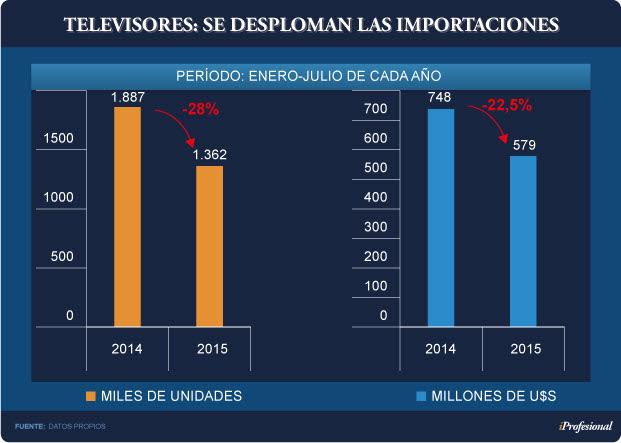 El mercado de los televisores LED también se ha visto seriamente golpeado por la escasez de dólares: durante los primeros siete meses del año el ingreso de estos equipos se redujo en medio millón de unidades, lo que representa una variación negativa cercana al 30%.
