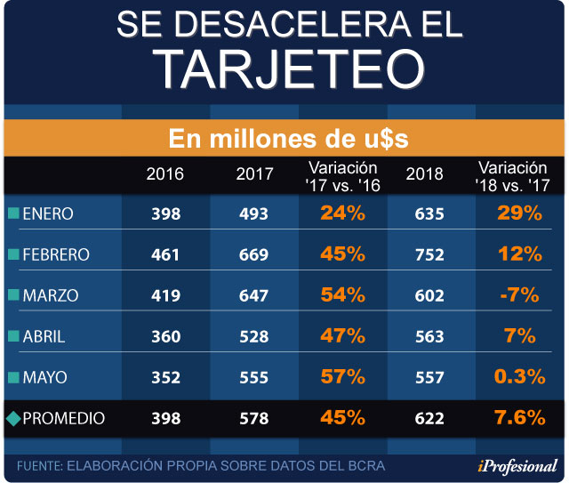 El amesetamiento que están mostrando los gastos con plásticos fuera del país adquiere relevancia si se tiene en cuenta que justo el año pasado, es decir en mayo de 2017, la tasa de crecimiento había sido de un explosivo 57% respecto de mayo de 2016.