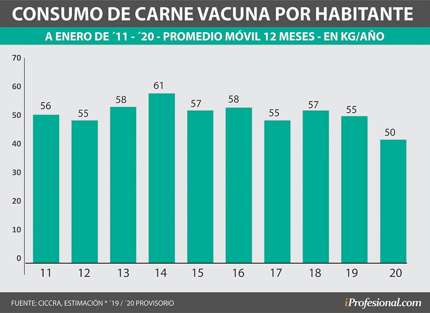 En 2019, el consumo interno fue de 51,2 kilos por habitante, registrando una caída de casi 10%, con el agravante de que durante el transcurso del primer trimestre del año pasado, este indicador llegó a tocar nivel más bajo de los últimos 50 años, con 49,6 kilos per cápita.