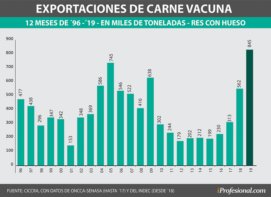 En términos de res con hueso, entonces los envíos totalizaron casi 845.000 toneladas, con un alza del 50 por ciento. Además, representó un nivel 9 puntos superior al récord previo, que había tenido lugar en 1969.