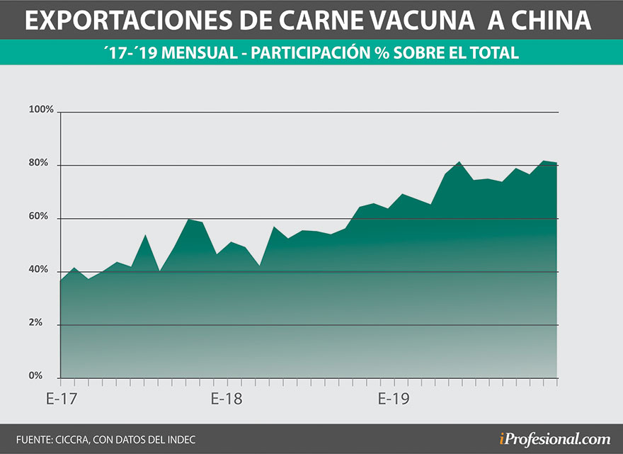China tiene un poder gravitante sobre el negocio de la carne en la Argentina: según CICCRA, su participación sobre el volumen total exportado alcanzó el 75% en 2019.