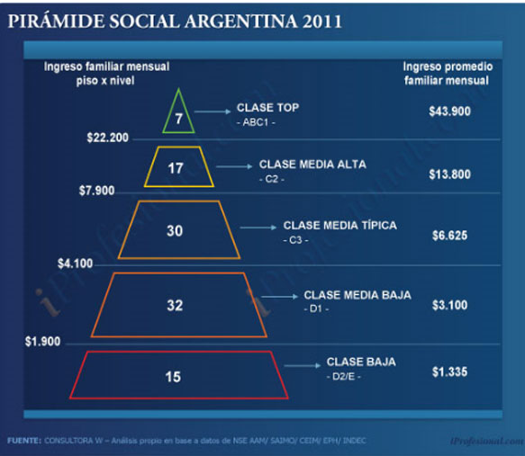 En un intento de cuantificación sobre la clase media nacional, puede tomarse como referencia la pirámide de ingresos elaborada por Guillermo Oliveto, titular de la consultora W, y uno de los expertos más influyentes en el ámbito análisis de consumo, estratificación y tendencias de la población.