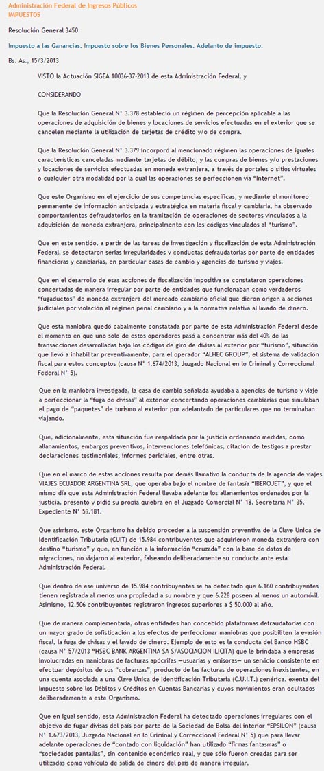 Según la Resolución General 3.450 publicada en el Boletín Oficial, firmado por el titular de la AFIP, Ricardo Echegaray, la medida se toma en base a las "serias irregularidades y conductas defraudatorias por parte de entidades financieras y cambiarias, en particular casas de cambio y agencias de turismo y viajes".