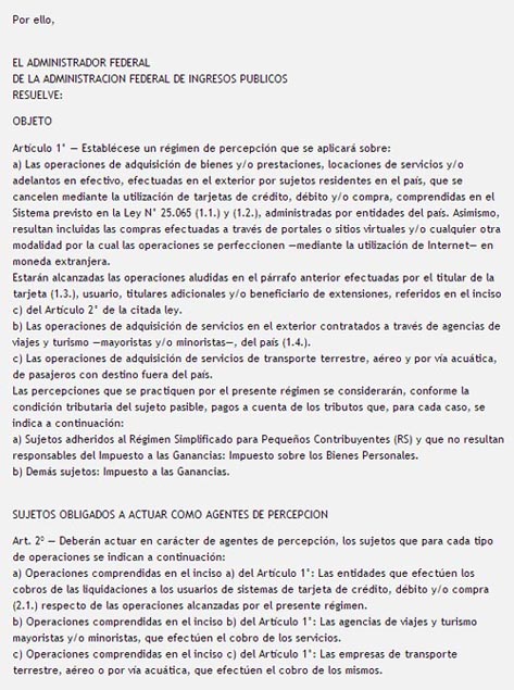 Desde septiembre, la AFIP viene aplicando un recargo similar pero para las operaciones realizadas con plásticos en moneda extranjera, como puede ser la compra de indumentaria en un mall de Miami, el pago de la cuenta de un restaurante de Florianópolis, o la adquisición, vía Internet y desde la Argentina, de cualquier producto ofrecido por una tienda virtual del exterior.