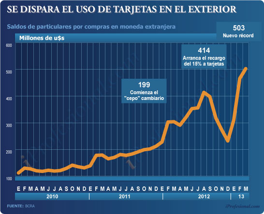 En efecto: el monto a cancelar por adquisiciones en moneda extranjera superó los u$s500 millones, un 65% más que el promedio de marzo del año pasado y un 150% por encima que el de octubre de 2011, momento en el que el Gobierno aplicara el recargo al uso de plásticos.