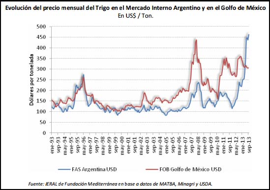 En el siguiente gráfico se puede observar este comportamiento en la evolución del precio mensual del trigo, tanto en el mercado local como en el Golfo de México.
