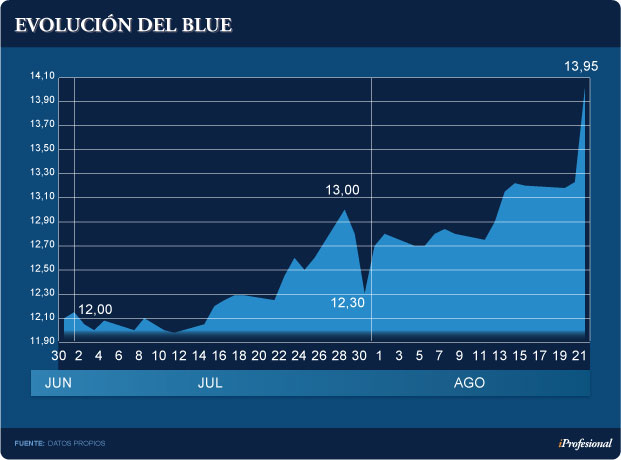 De hecho, estos "desafíos" incrementaron los temores e impulsaron al blue: a mediados de mayo tocó los $11, a principios de junio pasó los $12, a fines de julio llegó a $13 y, luego de un breve bajón, en los últimos días siguió su carrera ascendente hasta el cierre de ayer en 13,95 pesos (ver cuadro).