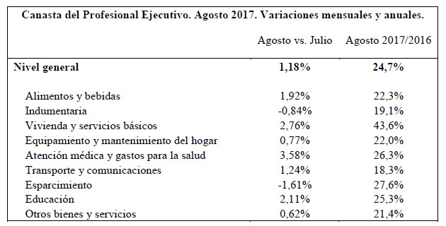 La inflación en la Canasta del Profesional Ejecutivo (CPE) fue de 1,18% en agosto y acumula un alza de 24,7% en los últimos doce meses, según detalla el relevamiento que realiza mensualmente el Centro de Economía Aplicada de la Universidad del CEMA.