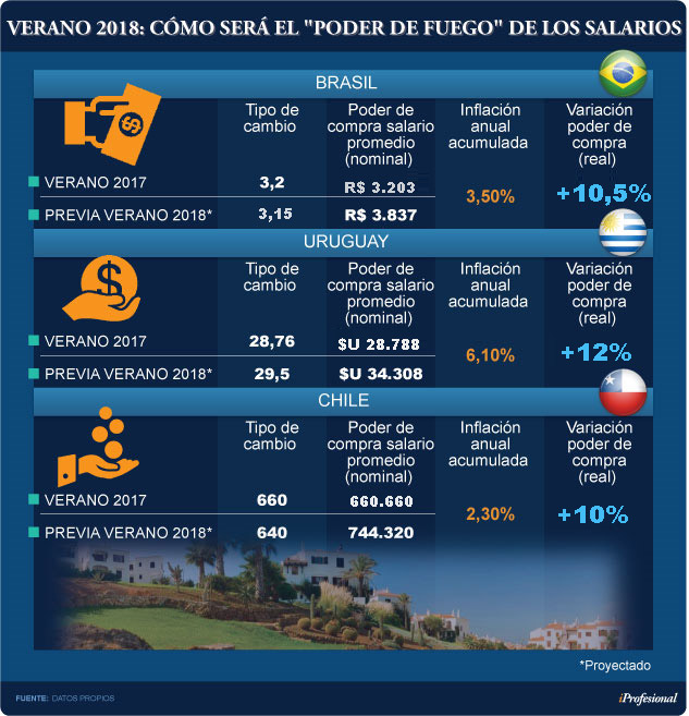 "¢ Dado que el salario promedio "rendirá" u$s1.163 de cara al inicio de la temporada, esto implica que el próximo verano se podrá adquirir el equivalente a 3.663 reales, por encima de los 3.200 de enero pasado.