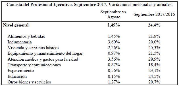 En los últimos doce meses la inflación de la canasta ejecutiva acumula un alza de 24,4% y, si se consideran los nueves meses transcurridos de 2017, el aumento fue del 17,7%, similar a lo reportado por el INDEC para la canasta general.