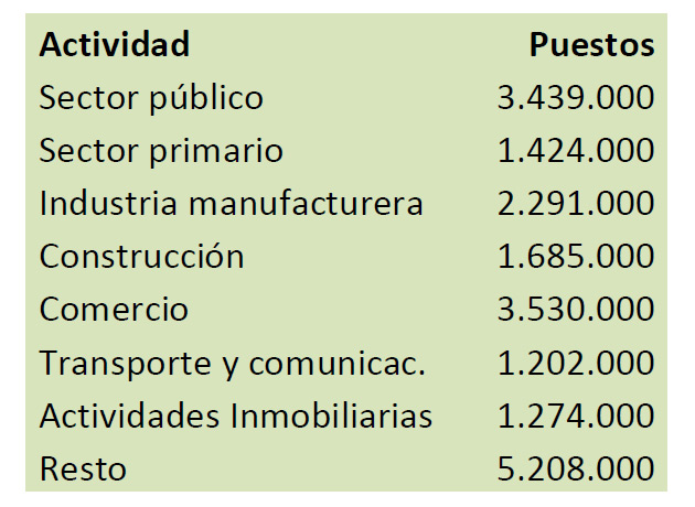 En cuanto a los puestos de trabajo no asalariado (cuentapropistas) se concentran en el comercio (1.632.000), la construcción (725.000), la industria manufacturera (629.000) y el sector agropecuario (433.000).