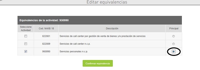 Pulsar sobre el í­cono en la columna de equivalencias sugeridas para la actividad y seleccionar la que corresponda. Repetir el proceso para todas las actividades que figuran en el listado.