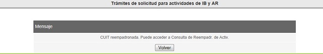 1. Puede suceder que el contribuyente ya haya sido reempadronado de oficio y por alguna razón no haya sido comunicado. En este caso, al intentar reempadronarse, el sistema mostrará la pantalla en donde el trámite ya ha sido efectuado, y no deberá hacer nada, solo si es necesario consultarlo.