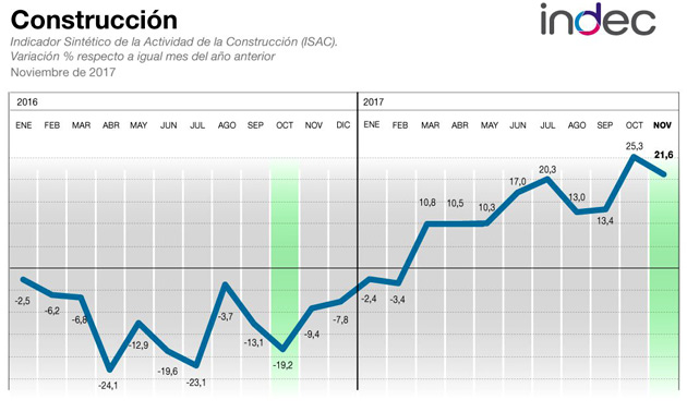 Por su parte, la actividad de la construcción creció en noviembre un 21,6% en forma interanual, alcanzando nueve meses consecutivos de alza por encima de los dos dígitos.