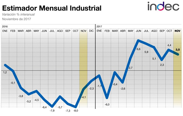 La actividad industrial creció 3,5% durante noviembre en relación a igual mes del año pasado, mientras que la construcción avanzó 21,6%, informó este jueves el Instituto Nacional de Estadística y Censos (INDEC).
