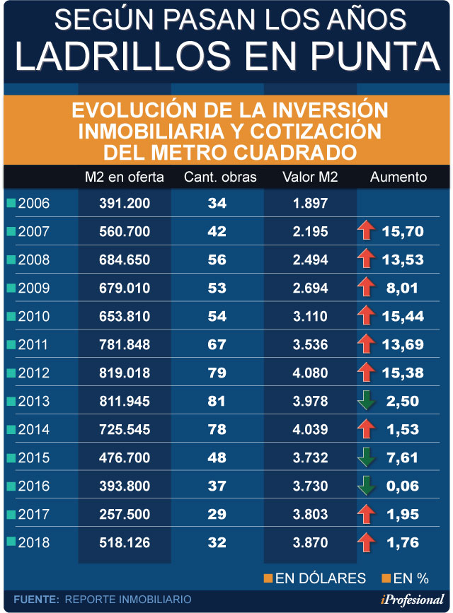 Desde Reporte Inmobiliario afirman que el valor promedio del metro cuadrado se ha mantenido relativamente estable a lo largo de los últimos doce meses: pasó de los u$s3.800 a los u$s3.870.