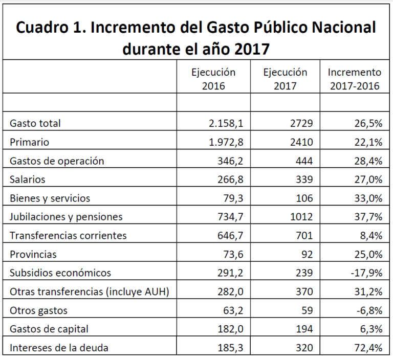 Esta tasa de inflación se ubica entre el porcentaje de incremento del gasto primario del sector público nacional (que fue del 22,1%) y el porcentaje de incremento del gasto total (que fue del 26,5%). Estas cifras se pueden observar en el Cuadro 1, que a su vez las presenta desagregadas por grandes rubros del presupuesto.