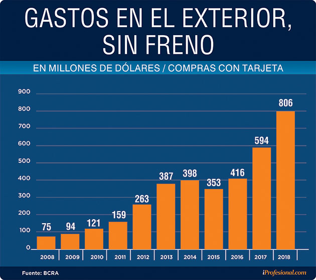 Según datos del Banco Central, que sigue día a día la evolución de las compras con tarjetas de crédito realizadas por argentinos en moneda extranjera, los saldos por estos gastos acumularon una cifra récord, de más de u$s800 millones.