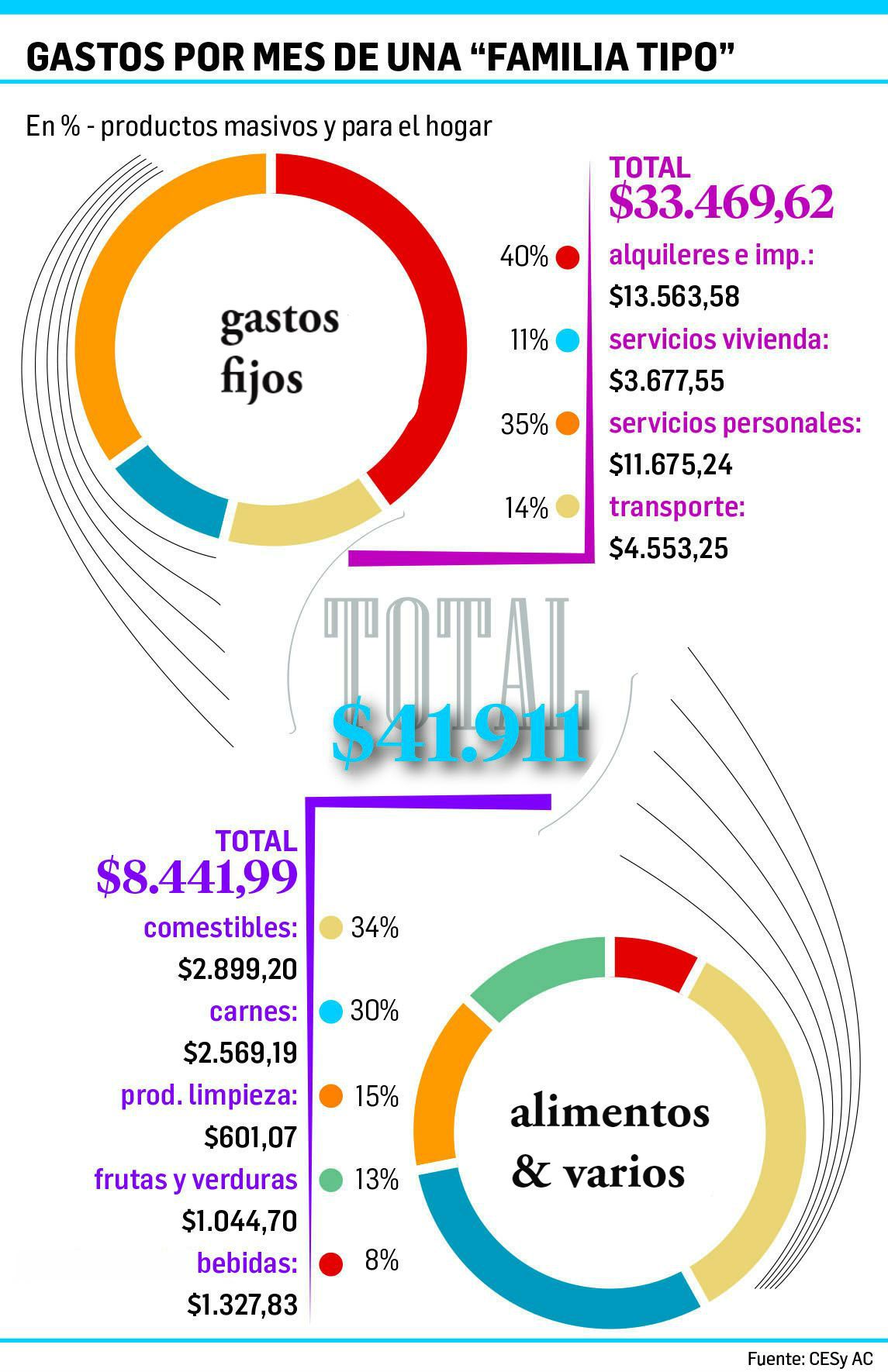 Una familia tipo -de cuatro integrantes- ya destina $42.000 por mes para vivir en la Argentina. Y de ese total, el 80% de los gastos corresponde a servicios fijos, entre los que se destaca el pago del alquiler, los impuestos, la cuota de un colegio privado y el dinero que se destina para el transporte público.