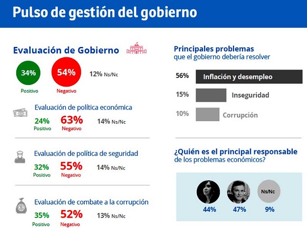 "Estas situación se complementa con una evaluación negativa de la gestión de gobierno en general y de las diferentes áreas en particular. Mientras que el nivel de rechazo a la gestión de gobierno y a la polí­tica económica rozan sus máximos históricos las polí­ticas de seguridad y anti corrupción, dos í­tems donde el macrismo se hace más fuerte, presentan caí­das significativas", agregó.