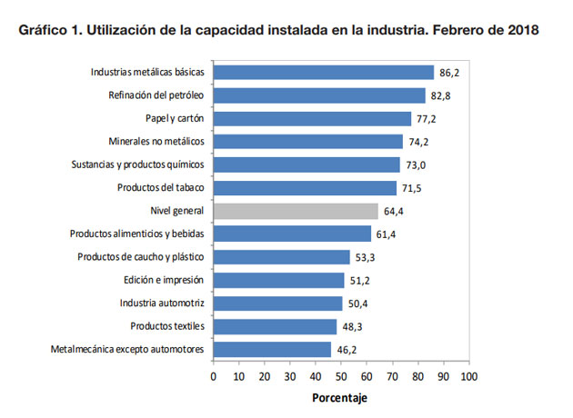 La utilización de la capacidad instalada de la industria aumentó en febrero al 64,4% contra el 60% de igual mes del 2017, tiempo en que medió un crecimiento del 5,3% de la actividad fabril, informó este miércoles el INDEC. Además, avanzó 2,8% con respecto a enero, cuando el indicador se colocó en 61,6%.