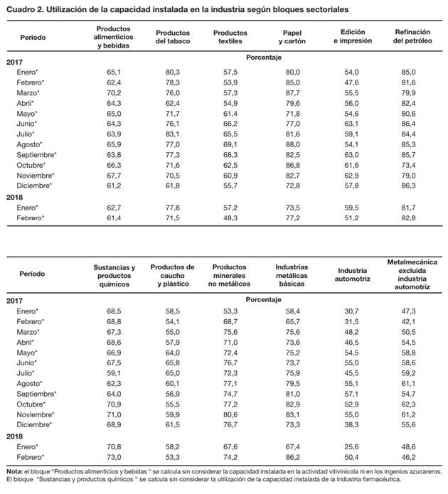 Los bloques que presentaron en febrero niveles de utilización de la capacidad instalada superiores al nivel general son: industrias metálicas básicas, 86,2%; refinación del petróleo (82,8%); papel y cartón (77,2%); productos minerales no metálicos (74,2%); sustancias y productos químicos (73%); y productos del tabaco (71,5%).