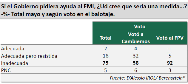 D'Alessio IROL/Berensztein realizó su medición durante el fin de semana, porque consideró que acudir al FMI era una posibilidad y quiso conocer la opinión pública al respecto.