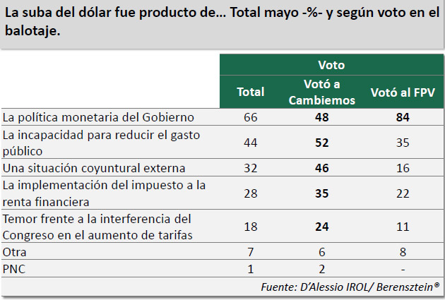Sin embargo, la cuestión cambia cuando se analiza según la adhesión política de los encuestados. Así, entre los votantes de Cambiemos la principal causa de la corrida cambiaria fue "la incapacidad para reducir el gasto público". En cambio, quienes votaron al FpV colocan a esta cuestión como segunda, muy por debajo de la política monetaria.