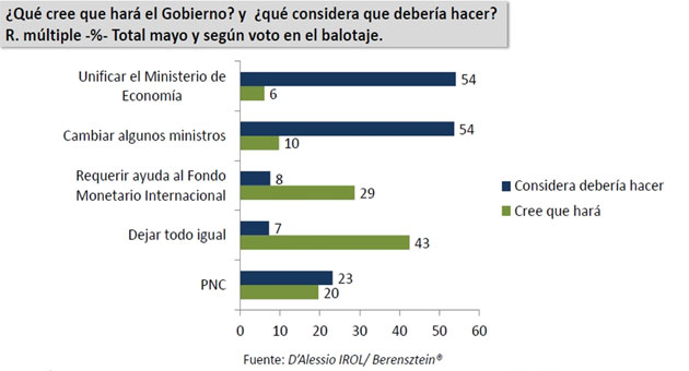 Las recomendaciones más frecuentes de los participantes fueron unificar el Ministerio de Economía y cambiar algunos ministros, ambas con el 54% de adhesiones. Recurrir al Fondo Monetario, por su parte, se ubicó con un escaso nivel de aceptación: 8%.