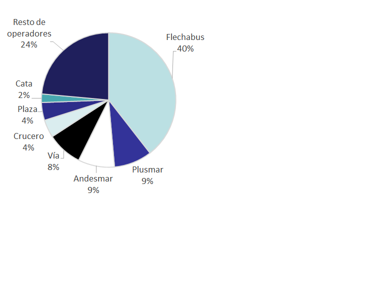Flechabus se erige como el principal operador de transporte interurbano, con un 40% del total del parque automotor. Le siguen Plusmar y Andesmar, con el 8% cada uno, y luego Vía, con el 8%. Se trata de un mercado compuesto por 119 empresas, de las cuales 79 pertenecen a 15 grupos empresarios, indicó el reporte.