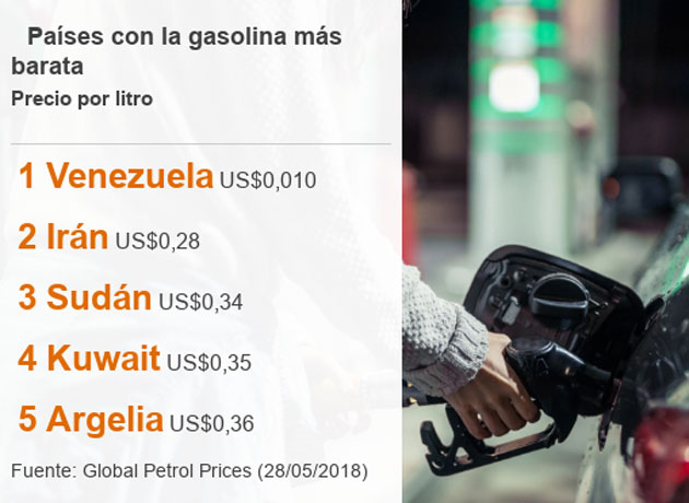 El combustible también es muy barato en Irán (u$s0,28 por litro), en Sudán (u$s0,34/litro), ambos grandes productores tanto en Asia como en ífrica, respectivamente. En Kuwait el litro cuesta u$s0,35 y en Argelia, el quinto más barato, cuesta u$s0,36/litro.