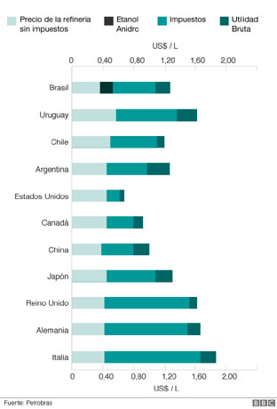 De acuerdo con la compañía brasileña Petrobras, el precio final del combusitble que paga el consumidor está compuesto por tres partes: una es el precio que establece el país importador o exportador, otra los impuestos que impone el gobierno y por último el beneficio que saque el vendedor final.