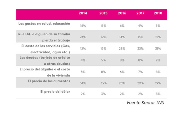 Por su parte, el precio de los alimentos fue uno de los ítems que más decreció: desde el 34% de 2014, hasta el 19% actual. En tanto que el temor a que el entrevistado o alguien de su familia pierda el empleo fue descendiendo desde el 24% de 2014 hasta el 15% actual. También bajó la preocupación sobre los gastos de salud y educación, desde el 15% de 2014 hasta el 5% de 2018.