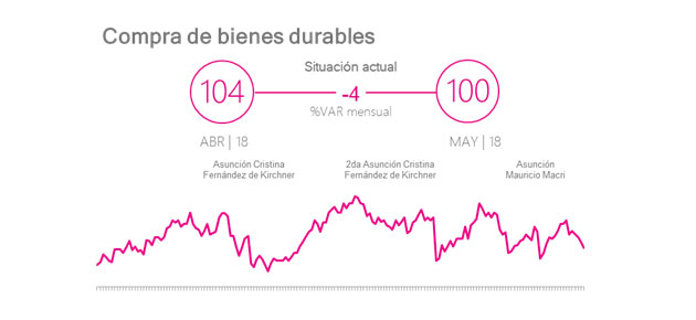 De esta forma, también los pronósticos a futuro se desploman, tal como indica el informe en cuanto a la predisposición de los argentinos a comprar bienes durables, como electrodomésticos. El indicador se retrajo en mayo por cuarto mes consecutivo, al mostrar caídas de 7% con respecto a igual mes de 2017 y de 4% en comparación con abril.
