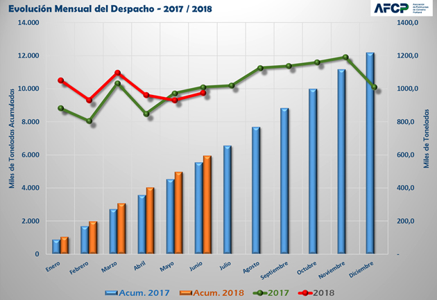 El siguiente gráfico ilustra la evolución mensual de los despachos de cemento, según AFCP: