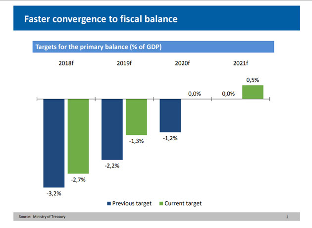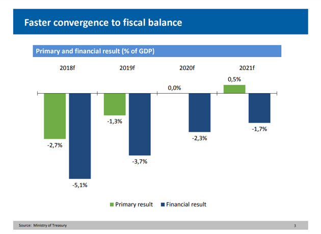 "Convergencia más acelerada hacia el balance fiscal", dice el título del gráfico que mostrará el ministro a sus interlocutores. Allí se dice que el rojo estipulado para 2019 deberá caer hasta 1,3% del PIB. Y que para 2020 habrá "déficit cero".
