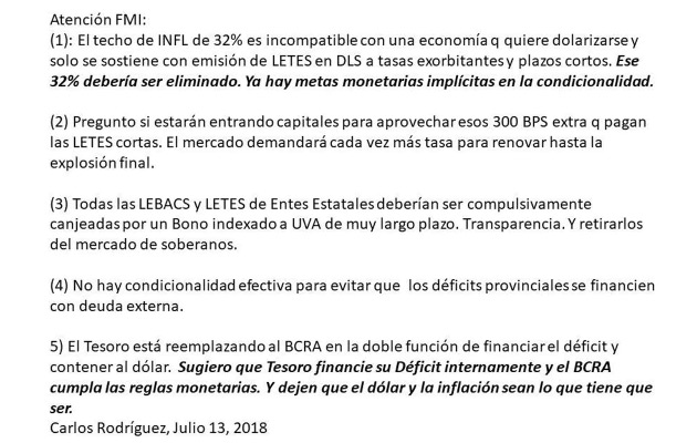 Mediante su cuenta de Twitter, Rodríguez afirmó que "para cumplir las metas de inflación del FMI están atrasando al dólar de nuevo, con las tasas de LETES a 90 días más altas del planeta. Ahora lo hace el Tesoro".
