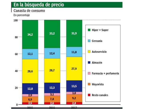 Los tres canales de venta: e-commerce, supermercados de descuento y mayoristas aportarán el 15,3% de las ventas de la canasta de consumo masivo en 2020, esto es, "2,1 puntos más que en 2017", destacó el informe.