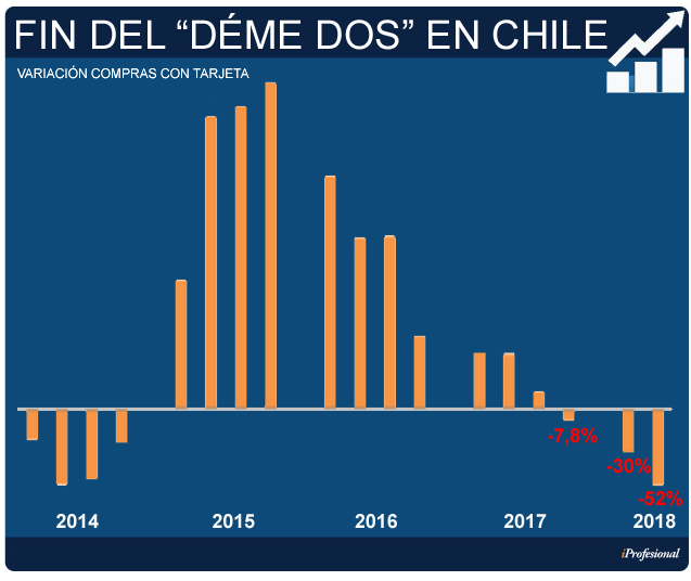 Según un informe elaborado por la CNC, en base a datos de Transbank -empresa encargada de administrar las tarjetas-, las compras de argentinos con plásticos de crédito y débido se desplomaron 52% en el segundo trimestre del 2018.