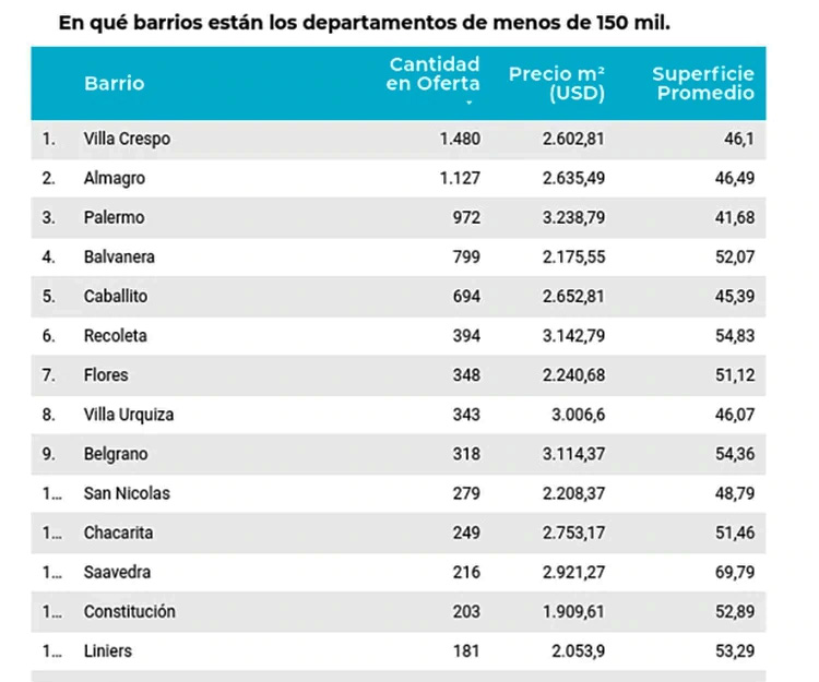 En este grupo de precios, el barrio de Palermo presenta la mayor oferta: 233 unidades, que tienen una media de 46,7 m2. Siguen Villa Crespo, con 263 unidades y 62,2 m2; Almagro, con 224 unidades y 62,6 m2; Caballito, con 164 unidades y 58,2 m2); y Balvanera, con 125 unidades y 73,02 m2", explicó Gabriel Gruber, director regional de la plataforma.