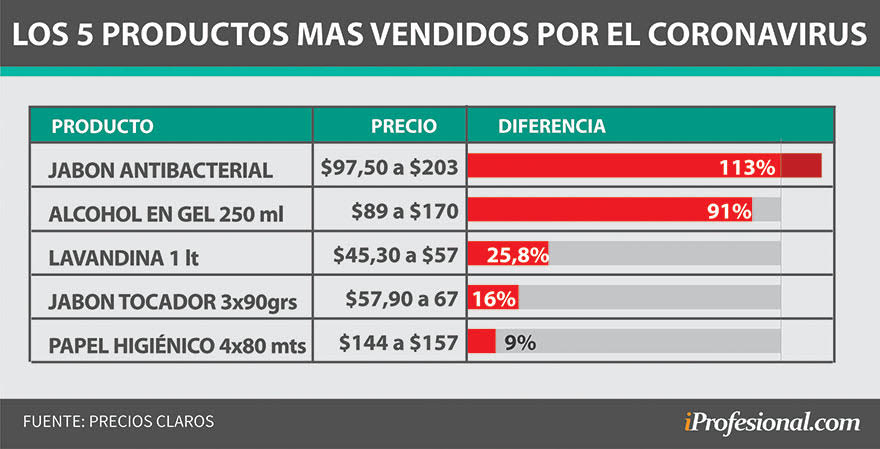 Esa dispersión roza el 20% en los alimentos. Y se escapa por arriba del 100% para los artículos más vendidos por la explosión de la crisis del coronavirus. El alcohol en gel se convirtió en el emblema de esa gran variación de precios.