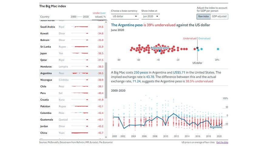 A través de esta comparación de un producto que es igual donde sea que se lo compre y de sus valores de venta al público en dólares en distintos países, la publicación determina en qué punto están sobrevaloradas o depreciadas respecto del dólar las monedas locales y los precios relativos de las economías.