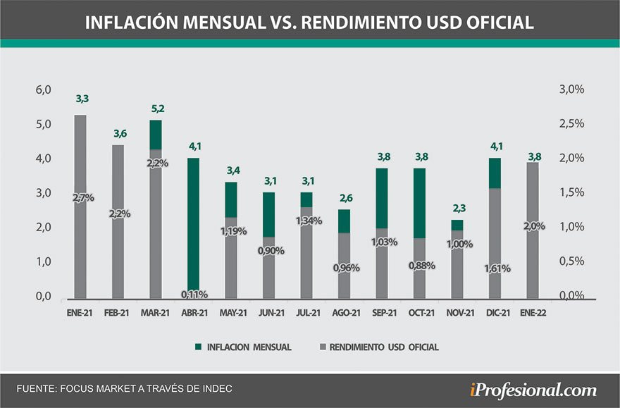 El dólar sería la forma más efectiva para no perder poder adquisitivo en una situación inflacionaria. Si equiparamos al dólar oficial versus el nivel de inflación en 2021, podemos ver cómo en toda esta serie mensual siempre la inflación estuvo por encima del rendimiento real del dólar oficial.