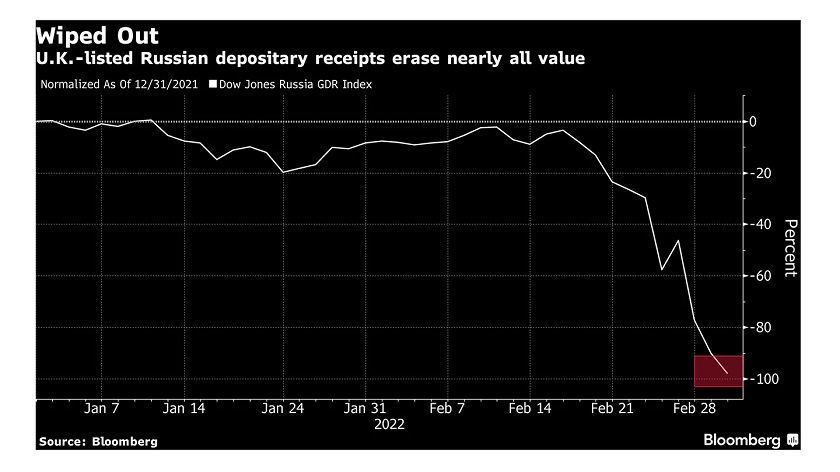 En tanto, los certificados de depósito de empresas rusas que cotizan en el Reino Unido se están quedando sin valor a medida que entran en vigor las sanciones contra ese país como consecuencia de la invasión militar a Ucrania.