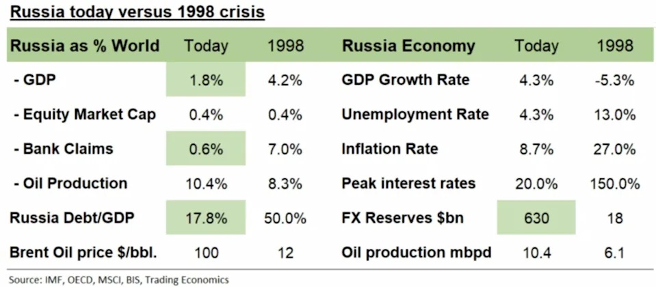 La última vez que Rusia impacto significativamente al mundo fue en 1998, con la mayoría de los bancos de inversión con posiciones en deuda rusa que se vieron severamente sacudidos y que incluso forzó el rescate del hedged fund Long Term Capital Management (LTCM) y la venta de Bankers Trust. Rusia entró en default y su moneda se devaluó de manera importante en medio de la crisis asiática.