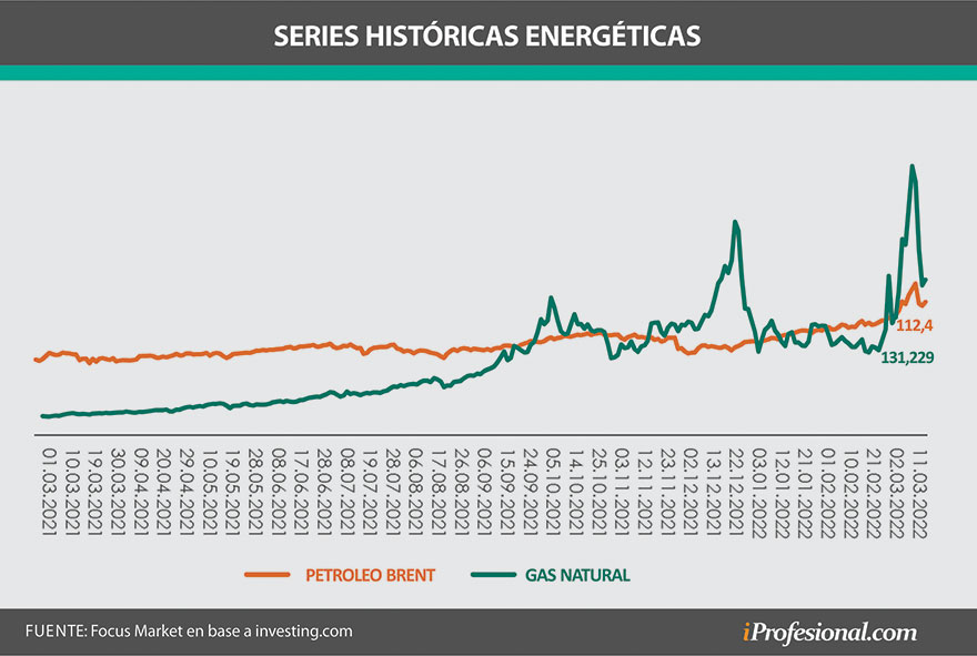 La situación entre Rusia y Ucrania, también se encuentra influyendo sobre el precio de las fuentes energéticas, tales como el petróleo Brent y el gas natural, entre otros. Con respecto a la situación del encarecimiento del petróleo Brent, se pudo ver que cerró en u$s112,4 el barril (toco un máximo durante el conflicto bélico de u$s127) y el gas natural finalizo en u$s131,2 el megavatio hora (MWh).