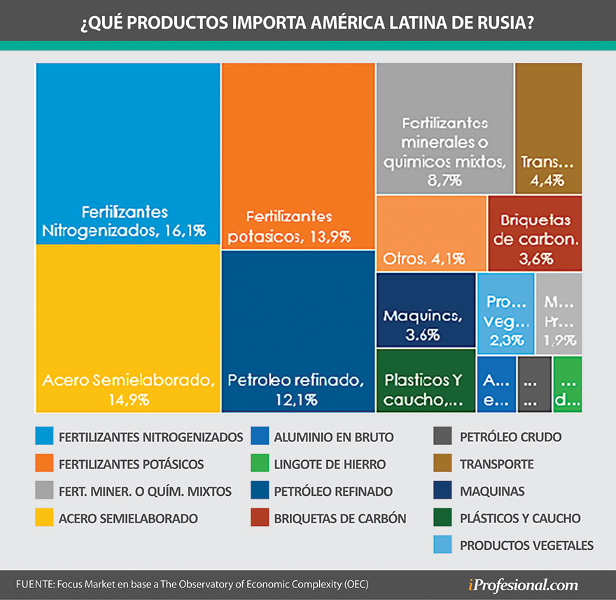Bajo esta perspectiva, la situación también es compleja. Respecto del intercambio comercial no sólo de Latinoamérica (importa principalmente productos químicos como un 16, 1% en fertilizantes nitrogenados hasta metales como un 14% de acero semi-elaborado), sino para la Argentina también hay consecuencias complicadas.